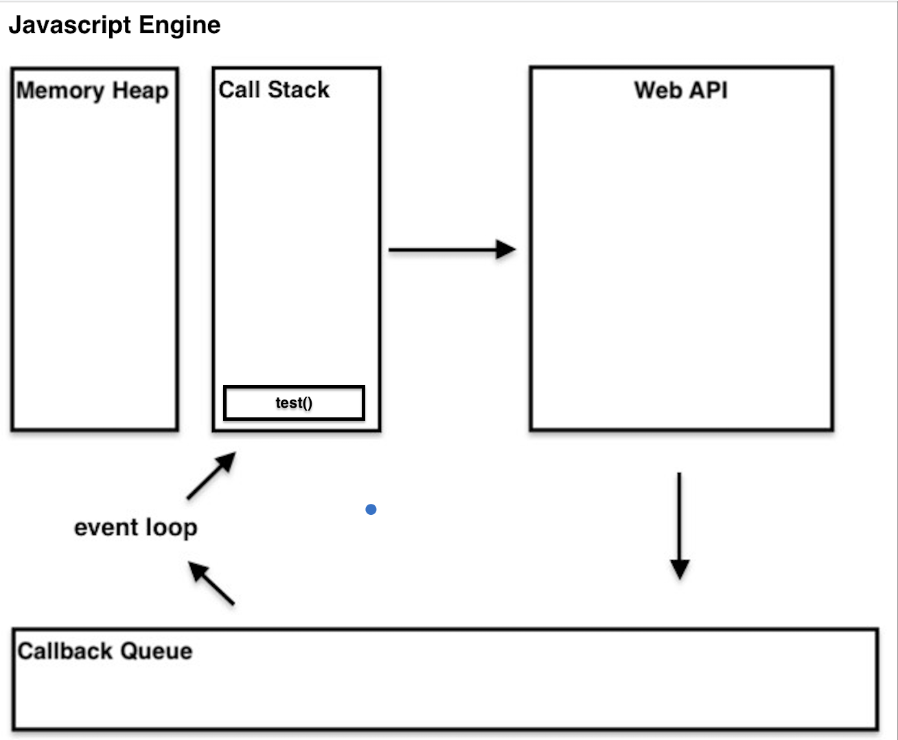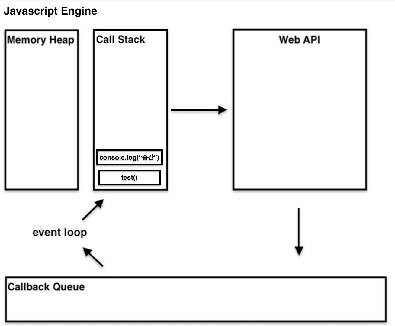 - event loop가 Call Stack이 비어있는지 확인하고 난 후 test() 함수를 Callback Queue로 부터 Call Stack으로 보내게 된다. 따라서 test() 함수 안에 있던 console.log("중간") 코드가 호출되고 실행되는 것이다.